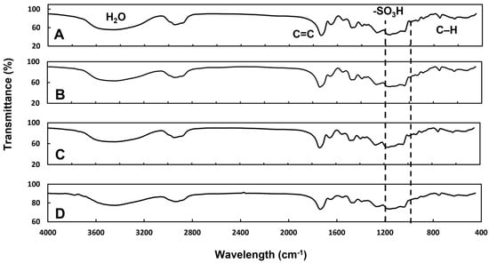 Figure 5 shows the FTIR spectra of the 152Sm2(CO3)3-PMA microspheres and PMA microspheres. The presence of the sulphonate groups (-SO3−) on the PMA and 152Sm2(CO3)3-PMA microspheres were indicated by the presence of peaks within 1000–2000 cm−1. These peaks remained in the 152Sm2(CO3)3-PMA microspheres after neutron activation (Figure 5C), suggesting that the sulphonate groups, which are important to attract the positive charged 152Sm ions, remained intact during the neutron activation. In addition, no alteration to other functional groups of the microspheres was observed after neutron activation.