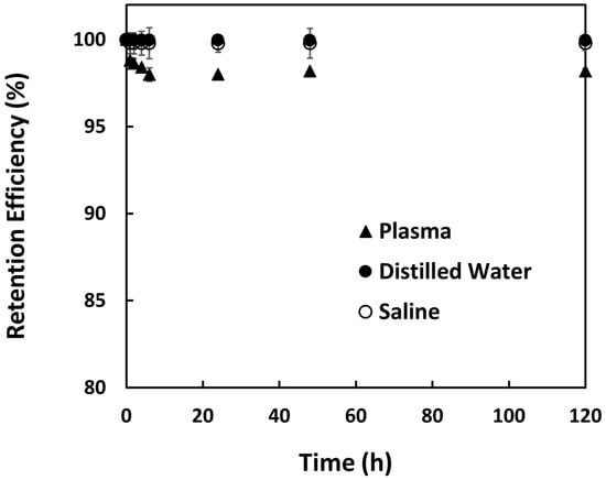 Retention (%) of 153Sm in 152Sm2(CO3)3-PMA microspheres suspended in distilled water, saline solution and human blood plasma over 120 h.