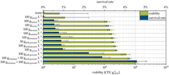 Viability and survival rate of yeast cells granulated with different protectants and MCC as the carrier. Granulation with fructose, glucose, and sucrose were not possible due to excessive gas formation of the cell suspension. Data points that do not share a letter are significantly different (significance level α = 0.05).