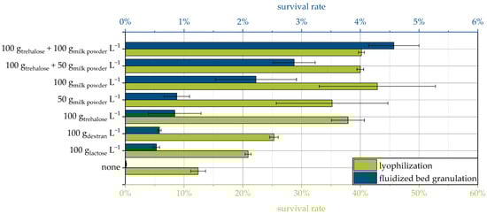 Comparison of the survival rates of yeast cells dried via fluidized bed granulation and lyophilization for selected protective additives. Results for lyophilization are from a previous study [9].
