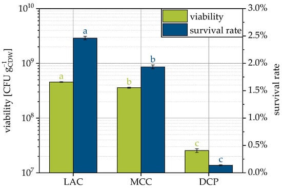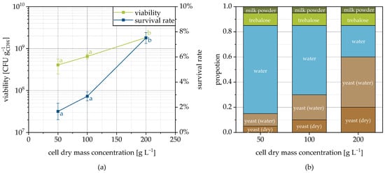 Viability and survival rate depending on the cell concentration of the sprayed suspension on MCC as the carrier (a) and the formulation composition (b). The amount of yeast (water) has to be understood as the cellular moisture content. Data points that do not share a letter are significantly different (significance level α = 0.05).
