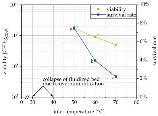 Dependency of viability and survival rate on inlet temperature for LAC as the carrier. Data points that do not share a letter are significantly different (significance level α = 0.05).