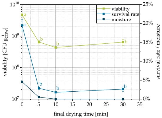 Viability, survival rate and moisture content of granules as related to the applied final drying time on MCC as a carrier. Data points that do not share a letter are significantly different (significance level α = 0.05).