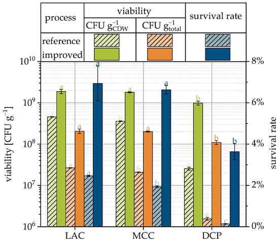 Viability related to cell dry weight and total granules weight as well as the survival rate for reference (Figure 4), and the improved process and formulation dependent on the carrier material. Data points that do not share a letter are significantly different (significance level α = 0.05).