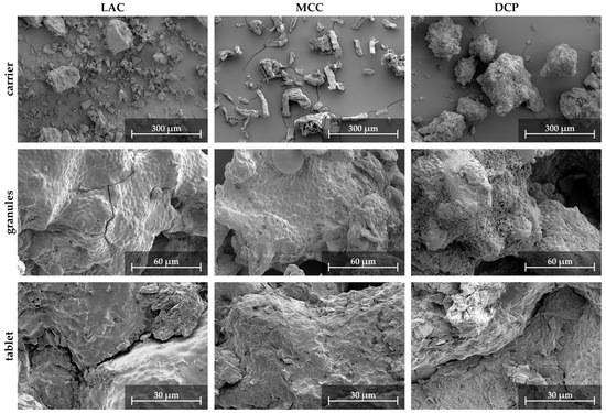 SEM images of carrier particles (first line), yeast granules based on the different carrier materials (second line), and the breaking area of tablets made at a compression stress of 400 MPa (third line).