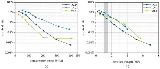 For all three carrier materials used, DCP, LAC and MCC, there is a logarithmic decrease in survival with increasing compression stress (Figure 10a), although in the case of MCC, stresses above 200 MPa hardly cause a further reduction in survival. The SEM images of the breaking surfaces of tablets made from the granules, shown in Figure 9, illustrate the deformation of the cells. It is plausible that this is associated with a disruption of the cell structure resulting in a lethal loss of integrity. As expected, the formulation significantly affects the viability of the microorganisms after tableting. The highest survival at a certain compression stress was reached with LAC, followed by DCP and MCC. Thus, LAC can be stated as the best suited of the carriers tested for granulation and subsequent tableting regarding the survival of the cells. The highest survival during tableting with LAC was also found when freeze-dried yeast cells were compacted with the same excipients [9]. In the case of lyophilizates, slightly higher survival rates were possible with MCC instead of DCP. However, it should be noted that the proportion of excipients was only 20% by weight in case of the lyophilizates and approx. 80% in case of the granules. Due to this, the influence of the various excipients is also more pronounced in the case of granules. In addition, the different bulk material structures must be taken into account as they are supposed to influence the survival during compression. In the case of the tableting of comminuted lyophilizate particles, these particles contained the dried microorganisms and were mixed with the excipients as a physical mixture. Contrary to this, in the case of the granules, the excipients were present as carrier particles inside the granules, with the microorganisms bound onto the surface. This results in different stress states acting on the cells, which are linked to different degrees of mechanical damage. For example, this could influence the possible extent of the particle rearrangement during densification. Although lyophilizate particles in voids between excipient particles could be shielded from stresses, whereas the microorganisms that adhere firmly to the surface of the granule particles are subjected to intense stresses, especially at the contact points. It has been reported that the reduction in viability of microorganisms during tableting is more pronounced in the case of ductile formulations, as with MCC, due to higher shear stresses, than with brittle materials such as DCP [24]. LAC is characterized by an intermediate deformation behavior with brittle and ductile deformation fractions. Nevertheless, the survival rate curve is not between those of DCP and MCC, but at a higher level. Possibly, in the case of DCP with very high deformation resistance, higher stress peaks occur locally, which cause more stress on the cells than in case of LAC with lower deformation resistance [9]. In this context, reference should also be made to the morphology of DCP, with numerous sharp-edged crystals, which can have a detrimental effect by puncturing or slicing the cell membrane, as proposed earlier [9].