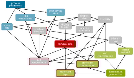 Scheme of influencing factors on the survival of microorganisms during fluidized bed granulation and their linkages. The main influences on the survival rate are highlighted with a red border.