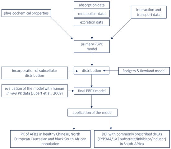 Flowchart of the bottom-up approach for building a PBPK model for substrate aflatoxin B1 and its applications []. PBPK = physiologically based pharmacokinetics; PK = pharmacokinetics; AFB1 = aflatoxin B1; DDI = drug–drug interaction; CYP = cytochrome P 450.