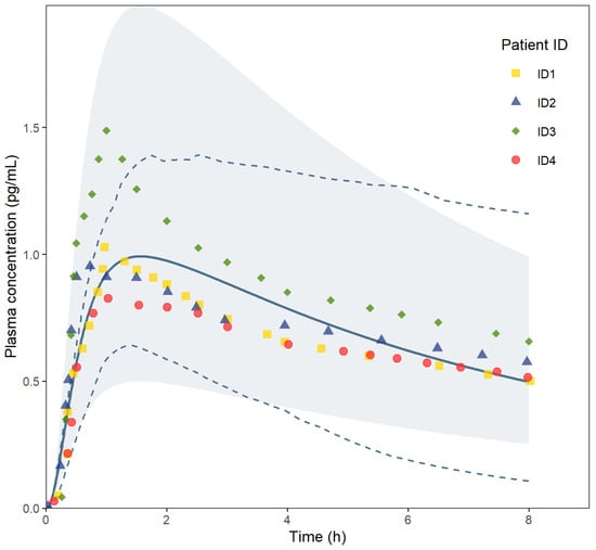 AFB1 plasma concentration (pg/mL) versus time (h) curve: predicted data by the PBPK model are shown by the blue line, and the observed data points of the four subjects from the in vivo trial are represented as coloured symbols (each colour represents a subject). The light blue area shows the twofold prediction. The dashed blue lines give the 5th–95th percentiles of the predicted plasma concentrations.