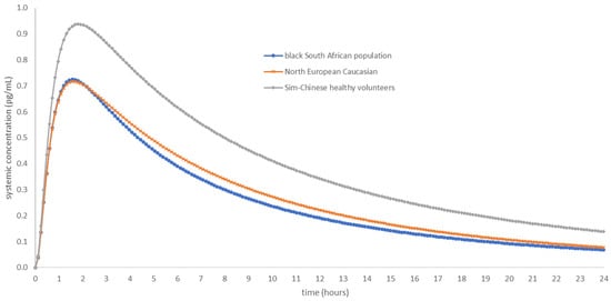As observed in Figure 4 and Table 6, outcomes can be different in populations exposed to the same compound and dose. Clearance in the Black South African population is 1.90-fold higher than the clearance in the Sim-Chinese healthy volunteer population. The clearance values clearly show that different populations demonstrate differences in drug disposition.