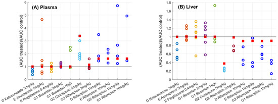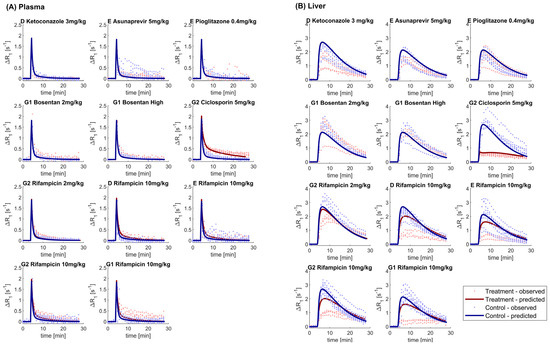 ) plasma (Panel A) and liver (Panel B) for different sites (D, E, G1, and G2) and drugs. Solid black line corresponds to the line of unity. Predictions using the gadoxetate physiologically-based pharmacokinetic model considered inhibition of both and , assuming unbound plasma concentrations to drive inhibition of each transporter of interest. = ratio of treated vs. control area under the curve of gadoxetate -time profiles (Equation (3)). Doses for each drug are listed in Table 1; “Bosentan_high” refers to the 4–6 mg/kg doses of bosentan.