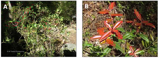 Aristotelia chilensis. (A) Detail of the tree. (B) Leaves of the plant. (www.fundacionphilippi.cl) (accessed on 18 January 2023).