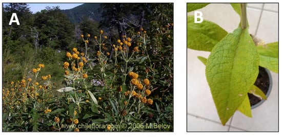 Buddleja globosa. (A) Detail of the plant. (B) Leaves of the plant. (www.chileflora.com) (accessed on 18 January 2023).