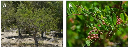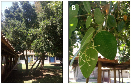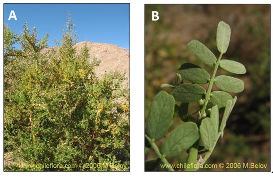 Geoffroea decorticans. (A) Detail of the tree. (B) Leaves of the plant. (www.chileflora.com) (accessed on 18 January 2023).