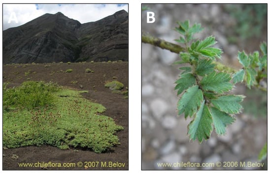 Acaena magallánica. (A) Detail of the plant. (B) Leaves of the plant. (www.chileflora.com) (accessed on 18 January 2023).