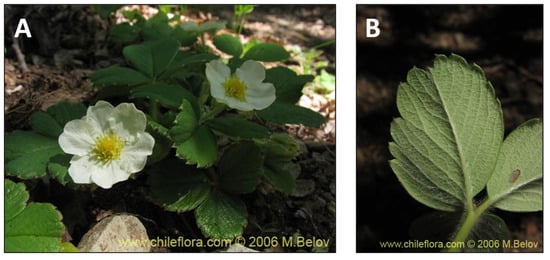Fragaria chiloensis. (A) Detail of the tree. (B) Leaves of the plant. (www.chileflora.com) (accessed on 18 January 2023).