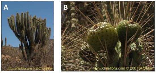 Eulychnia acida. (A) Detail of the tree. (B) Leaves of the fruit. (www.chileflora.com) (accessed on 18 January 2023).