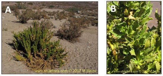 Haplopappus remyanus. (A) Detail of the tree. (B) Leaves of the plant. (www.chileflora.com) (accessed on 18 January 2023).
