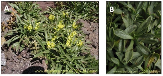 Laretia acaulis. (A) Detail of the plant. (B) Leaves of the plant. (www.chileflora.com) (accessed on 18 January 2023)..