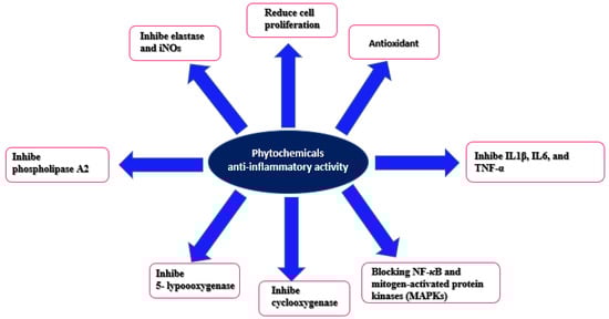 Several studies have reported that bioactive extracts and their natural compounds exert their anti-inflammatory properties by blocking two major signaling pathways, such as NF-κB and mitogen-activated protein kinases (MAPKs), which have the central role in the pro-inflammatory mediator’s production [142,143]. On the other hand, natural extracts are a natural, safe, and innovative therapy that can effectively treat allergic rhinitis [144]. Many cytokines are involved in this process, i.e., IL-9 could control the critical balance between homeostasis and inflammation. Furthermore, IL-9 signaling in the mucosal immune system is mainly present in allergic asthma, inflammatory bowel diseases, and other conditions [145]. Figure 15 illustrates the anti-inflammatory mechanisms related to the various phytochemicals shown.