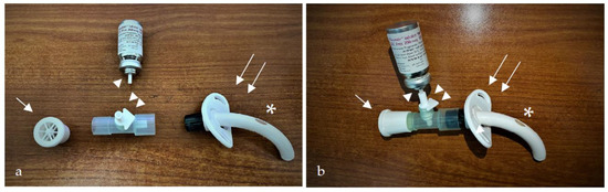 Photograph of the (a) disassembled and (b) assembled trans-tracheostomal retrograde device. The canister of the metered-dose inhaler (MDI) (arrowhead) is connected to a one-way T-shaped adaptor (two arrowheads). The adaptor is attached on its distal side to a one-way speaking valve (arrow) and on the proximal side to the fenestrated tracheostomy tube (two arrows). Notice the fenestration in the upper aspect of the cannula (asterisk).