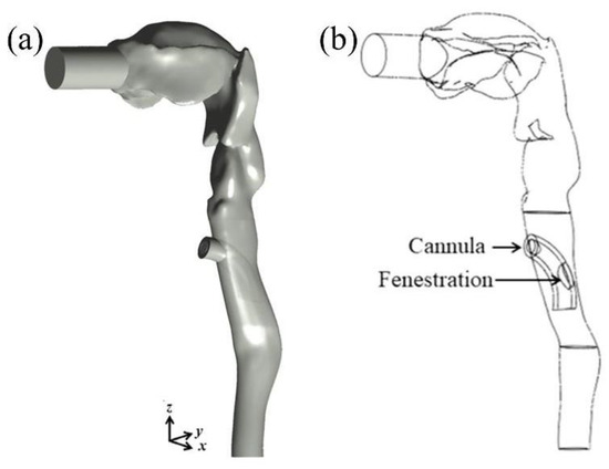 Computer-aided design (CAD) of the 3D extra-thoracic airway model introduced by Lizal et al. [21,22] and modified to include the simulation of a stoma and a cannula with fenestration. (a) General surface geometry and (b) wireframe view of the tracheostomy cannula and the corresponding fenestration at an estimated location of the 2nd tracheal ring shown in a sagittal plane.