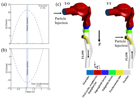 Modeled inhalation maneuver (i.e., flow rate over time) implemented for the (a) trans-oral and (b) trans-tracheostomal technique; shown in blue is the corresponding time window for particle injection (i.e., puff from MDI). Note that during (a) the trans-oral protocol, the patient inhales (i.e., positive airflow entering the mouth of the patient), whereas during (b) the trans-tracheostomal protocol, the patient exhales (i.e., negative airflow exiting the mouth of the patient). (c) CAD view of the extra-thoracic airway model with anatomic regions highlighted by color. g = Gravity; T-O = Trans-oral; T-T = Trans-tracheostomal.