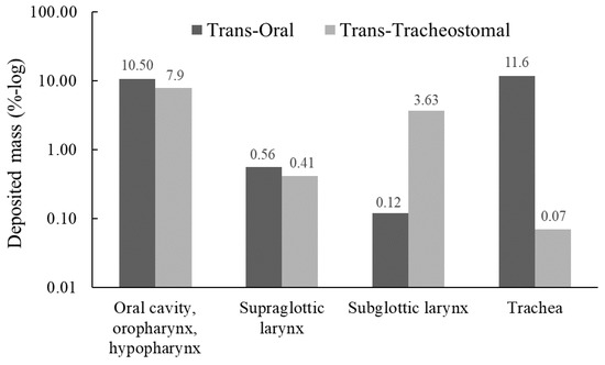 Figure 4 presents the deposited mass fraction (DF) of inhaled particles in the extra-thoracic model according to the trans-oral and the trans-tracheostomal techniques. Briefly, for the trans-oral inhalation, 66.42% of the particles reached the lower airways and lungs, leaving 33.57% deposited within the upper airway segment. Conversely, for the trans-tracheostomal retrograde technique, 85.09% of the particles exited through the mouth, leaving 14.90% deposited within the model. The highest deposition fractions in the trans-oral technique simulation were in the trachea (11.60%), followed by the oral cavity, oropharynx, hypopharynx (10.5%) and the supraglottis regions (0.55%). Only 0.11% deposited in the subglottis. The highest deposition fractions in the trans-tracheostomal retrograde simulation were in the oral cavity, oropharynx and hypopharynx (7.90%), followed by the subglottis (3.63%) and the supraglottis (0.40%) regions. The deposition fraction in the subglottis was 33 times higher (3.63%) in the retrograde trans-tracheal technique compared to the trans-oral technique (0.11%).