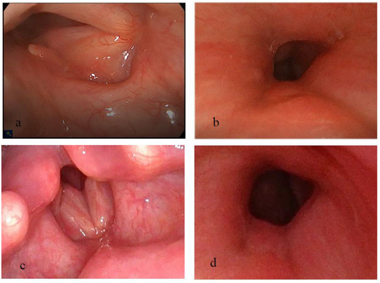The patient then started TRCI, according to protocol. During a 4-month follow-up period, an improvement in voice production was noticed, and the patient was able to breathe with a blocked cannula for short periods of time. The stent was then removed, with a residual grade 2 Cotton Myers subglottic stenosis (Figure 7a,b). Under the TRCI protocol, no granulation was noticed. The patient also had morbid obesity and high-grade chronic obstructive pulmonary disease. Thus, decannulation was not attempted. The patient is currently 18 months following stent removal and using TRCI treatment regularly. Periodic laryngeal examinations show no deterioration in laryngeal findings (Figure 7c,d).