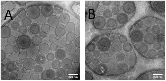 The mean size of Lip-ET and Blank-Lip values were equal to 230 nm and 163 nm, respectively (Table 1). The PDI values were less than 0.3, indicating the formation of monodisperse systems. The positive values of zeta potential for Lip-ET (17.3 ± 1.3 mV) and Blank-Lip (21.6 ± 1.2 mV) were due to the presence of the cationic lipid 3ß-[N-(N′, N′-dimethylaminoethane)-carbamoyl]cholesterol. The amount of ET encapsulated in these cationic liposomes was equal to 2.34 ± 0.32 g/L. Figure 1 shows CryoTEM images of Lip-ET extruded through a 400 nm filter (ten times) and a 200 nm filter (five times). The median size was 200 nm, confirming the results obtained by DLS. Most vesicles were unilamellar; also observed was the presence of some vesicles containing smaller ones inside of them.