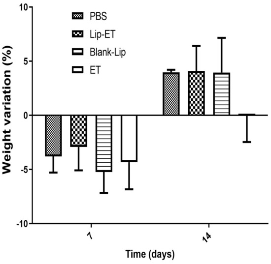 Female BALB/c mice body weight variation percentage after 7 and 14 days of intravenous administration of ET solution (16 mg Sb3 +/kg/day) (ET), Lip−ET (16 mg Sb3 +/kg/day), Blank−Lip and PBS (control) (n = 6 for each group). Data are the mean percentage of weight variation percentage ± standard deviation of the mean.