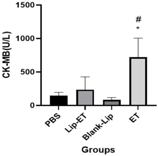 Evaluation of the CK-MB activity of BALB/c female mice 14 days after intravenous administration of PBS, Lip−ET (16 mg/kg of Sb3+), Blank−Lip and ET (16 mg/kg of Sb3+) (n = 6 for each group). Data are the mean ± standard deviation of the mean. # Indicates significant statistical difference (p < 0.05) between control and ET treated groups. * Indicates significant statistical difference (p < 0.05) between Lip-ET and ET treated groups. All data were analyzed by one-way ANOVA analysis of variance followed by Tukey’s test.