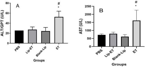 Evaluation of hepatic toxicity of BALB/c female mice 14 days after intravenous administration of PBS, Lip−ET (16 mg/kg of Sb3+), Blank−Lip and ET (16 mg/kg of Sb3+) (n = 6 for each group). (A,B) show ALT and AST activity, respectively. Data are the mean ± standard deviation of the mean. # Indicates significant statistical difference (p < 0.05) between control (PBS) and ET treated groups. * Indicates significant statistical differences (p < 0.05) between Lip−ET and ET treated groups. All data were analyzed by one-way ANOVA analysis of variance followed by Tukey’s test.