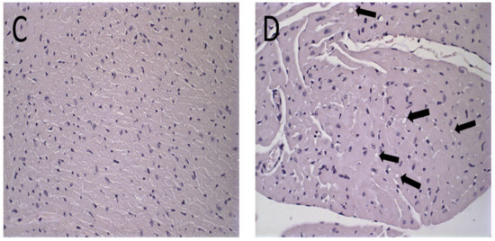 Histological sections of female BALB/c mice hearts stained by hematoxylin and eosin. (A) PBS, (B) Blank-Lip, (C) Lip-ET (16 mg/kg of Sb3+) and (D) ET (16 mg/kg of Sb3+). The black arrows indicate vacuoles in cardiomyocytes.