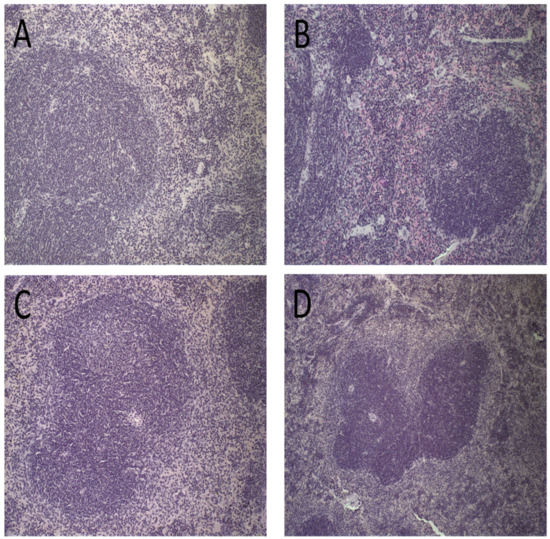 Histological sections of female BALB/c mice spleen stained by hematoxylin and eosin after treatment with PBS (A), Blank-Lip (B), Lip-ET (16 mg/kg of Sb3+) (C) and ET (16 mg/kg of Sb3+) (D).
