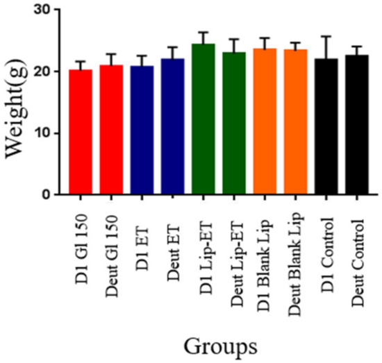 The effectiveness of treatments was evaluated experimentally in female BALB/c mice infected with L. (L.) infantum. Regarding the weight of animals on the first day of treatment and on the euthanasia day, there was no statistically significant difference between the groups of treatment (Figure 8) (p > 0.05). No other signs of systemic toxicity such as prostration or agitation, diarrhea, convulsions, piloerection or death were observed in all evaluated groups. It is worth emphasizing that this result may be due to the use of an ET dose twice as low as that used in the acute toxicity study.