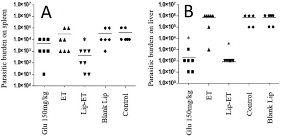 Evaluation of the parasitic burden in the spleen (A) and liver (B) of BALB/c mice infected with L. (L.) infantum and submitted to different treatments (n = 7 for each group). The treatments used were Glucantime® 150 mg/kg/day (Glu 150 mg/kg), ET solution (7.8 mg of Sb3 +/kg/day) (ET), Lip-ET (7.8 mg of Sb3 +/kg/day), blank liposomes (Blank-Lip) and untreated group (Control). Animals were treated for ten consecutive days intraperitoneally. Three days after the end of treatment, the parasitic burden was determined by the limiting dilution method. * Indicate significant statistical differences (p < 0.05) between control and treated groups. Dashes indicate the mean and symbols the individual values. Data were analyzed by one-way ANOVA analysis of variance followed by Tukey’s test.