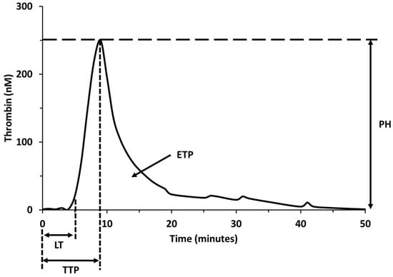 Quantitative parameters of thrombin generation. Lag time (LT); time to peak (TTP); thrombin peak height (PH); area under the thrombin curve or endogenous thrombin potential (ETP).