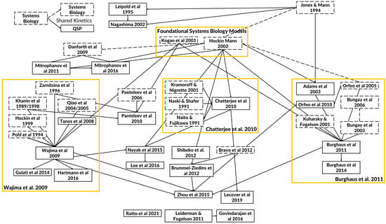 Diagram of key quantitative systems pharmacology (QSP) models of the coagulation cascade. The arrows depict how the whole or parts of the model (e.g., kinetics) have been adopted and modified between published models. The solid boxes indicate QSP models, and the dashed boxes indicate SB models. The solid arrows are used to link QSP models that share model equations and parameters from the original to the adopted model. The dashed arrows are used to link SB models. Models that are listed without any connections do not share significant common components. From over thirty years of mathematical models, there have emerged foundational systems biology models and three separate foci containing the legacy QSP models (shown in yellow boxes) with distinct applications [2,3,4,5,6,11,12,13,14,15,16,17,18,19,22,24,25,26,27,29,30,31,32,33,34,35,37,43,44,49,51,52,53,56,66,67,68,69,70,73,74,80,85,86].