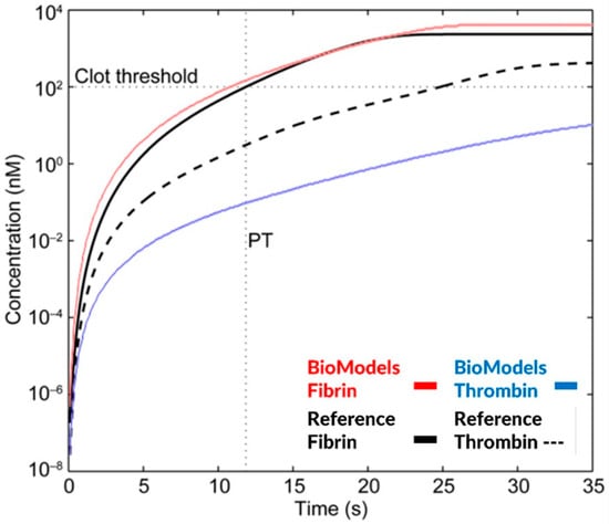 Future QSP models would benefit from using the legacy models to ensure that the intrinsic, extrinsic, and common pathways of the coagulation cascade are comprehensively represented and that only the validated kinetics of the proteases, cofactors, regulators, fibrin, and effects of anticoagulants are propagated in future models. More recent models have begun to adopt these legacy models for investigating in vivo biomarkers [33], the effects of hemophilia on coagulation [18], and the effects of anticoagulants [19,34,37]. To facilitate their adoption, even more, further validation of legacy models would increase confidence in their predictions of clotting times, thrombin generation curves, and response to therapies. Because the kinetics of thrombin generation is sensitive to initial concentrations of coagulation factors, simulating profiles for individual patient whole-blood samples could be used to fine-tune these models to be able to explain a broader range of thrombin generation and clotting times for different blood compositions. The legacy models could be more robust by explaining more extreme scenarios of in vitro blood clotting such as the effects of very high doses of warfarin (INR > 9) with a physiological clotting time and thrombin level.