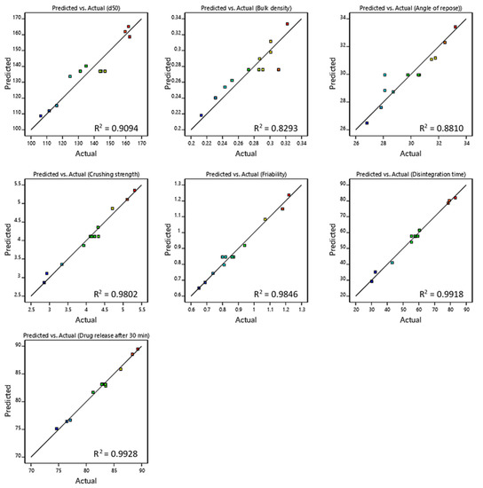 Linear correlation plot relating mean granule size, bulk density, angle of repose, crushing strength, friability, disintegration time, and drug release after 30 min between the predicted and the actual values.