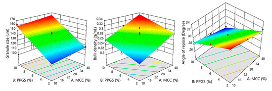 The regression analysis depicted in Table 6 demonstrates that the two parameters had significant effects on granules’ flowability (p < 0.0065 for MCC and p < 0.0001 for PPGS). Additionally, the PPGS level had the greatest effect on granules’ flowability, followed by the MCC level, with respect to the sum of square values (32.99 for PPGS and 7.55 for MCC). The negative sign of coefficients estimate in Equation (6) (−1.12 for MCC and −2.35 for PPGS) showed that the two variables had positive effects on improving granules’ flowability, integrated with the response surface plot (Figure 2); it could be noticed that granule flowability achieved its superior value with the simultaneous increase in the levels of MCC and PPGS. In contrast, granules’ flowability was lowest when both variables were at their minimum. This might be because increasing the levels of PPGS and MCC improved the granule size, which might lead to an increase in granules’ flowability. A high correlation between the angle of repose values and the granule size (r2 = 0.8075) was observed.