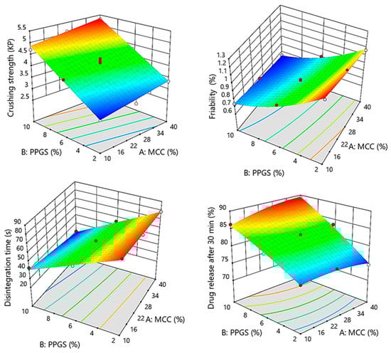 The ANOVA analysis listed in Table 8 demonstrates that all independent variables had significant effects on tablet crushing strength (p < 0.0007 for MCC and p < 0.0001 for PPGS). As shown by Equation (7), all the significant variables had a positive impact on tablet crushing strength based on the sign of coefficients estimate (+0.245 for MCC and +1.0 for PPGS), indicating that increased levels of these variables resulted in a higher crushing strength of the obtained ODMTs. This is due to the excellent compactibility of MCC at low compression pressure as well as the better binding effect of PPGS [21,22]. Combined with the response surface plot shown in Figure 3, a high level of MCC and PPGS would result in higher crushing strength, as shown in the top corner of the response surface plot. However, the response surface plot shows the predominant effect of PPGS on tablet crushing strength in a positive direction.