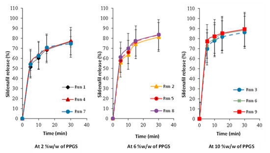 Figure 4 displays the release profiles for all formulations. As shown in Table 7, the percentage of sildenafil released after 30 min varied from 76.49 ± 1.15% to 89.31 ± 2.17%. In general, the drug release decreases with increasing DT of ODMTs, as shown in runs 1, 4, and 7, which contain low levels of PPGS (2%), whereas other runs demonstrated an acceptable dissolution profile since they released >80.0% of sildenafil after 30 min. Thus, the dissolution rate of ODMTs was impacted by the level of PPGS. The influence of independent variables on the dissolution of the obtained ODMTs is shown by the empirical model of Equation (10).