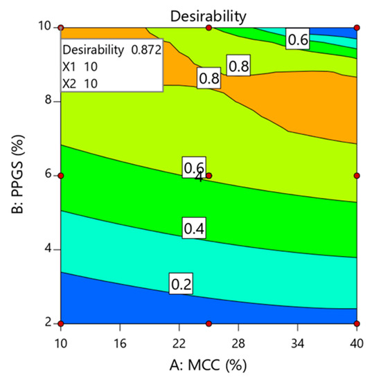 The ANOVA analysis listed in Table 8 reveals that both independent variables had significant impacts on DT (p < 0.0024 for MCC and p < 0.0001 for PPGS). In addition, the PPGS level had a pronounced effect on DT, followed by the MCC level, according to the sum of square values (3052.37 for PPGS and 84.98 for MCC). The negative sign of coefficients estimate in Equation (8) (−3.76 for MCC and −22.56 for PPGS) showed that the two variables had positive effects on reducing the DT. Joined with the response surface plot (Figure 3), it could be noticed that the DT achieved its minimum value with the simultaneous increase in the levels of PPGS and MCC with a predominant effect of PPGS. The interaction effect between the two variables (i.e., MCC and PPGS) had no significant effect on the DT (p = 0.4243).