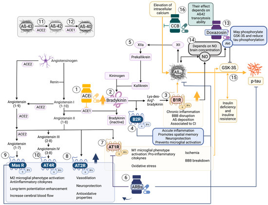 - Ribeiro, V.T.; de Souza, L.C.; Simões e Silva, A.C. Renin-Angiotensin System and Alzheimer’s Disease Pathophysiology: From the Potential Interactions to Therapeutic Perspectives. Protein Pept. Lett. 2020, 27, 484–511. [Google Scholar] [CrossRef] [PubMed]