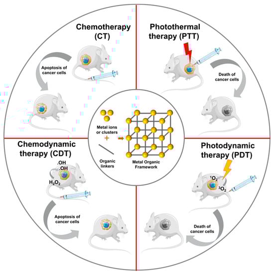Recently, MOFs have been developed as nanocarriers of medicines for cancer treatment [,]. The advantages of MOFs are their huge specific surface area, high porosity, and size controllability. They may be utilized as photothermal agents, photosensitizers, and Fenton reaction catalysts in chemodynamic therapy (CDT), photodynamic therapy (PDT), and photothermal therapy (PTT) (Figure 1). The poly(acrylic acid-mannose acrylamide) that further functionalized MOF-808 provided highly effective selective drug delivery with high cytotoxicity in HepG2 human hepatocellular carcinoma cells []. To increase the biocompatibility, extend blood circulation time, and target the encapsulated medication to the folate-expressing MCF-7 breast cancer, UiO-66 nanoparticles and folate-conjugated pluronic F127 were integrated []. Encapsulated in ZIF8 and loaded onto gelatin nanofibrous, phenamil, an activator of bone morphogenetic protein pathways, can kill MG-63 cells in vitro and suppress the formation of subcutaneous tumors in vivo []. In addition, MOFs can be loaded with therapeutic agents (drugs, photothermal agents, photosensitizers, etc.) for use in CT, PTT, PDT, CDT, and other tumor-specific treatments. In this article, we will discuss the most up-to-date findings about therapy-targeted MOFs as a foundation for cancer therapy.