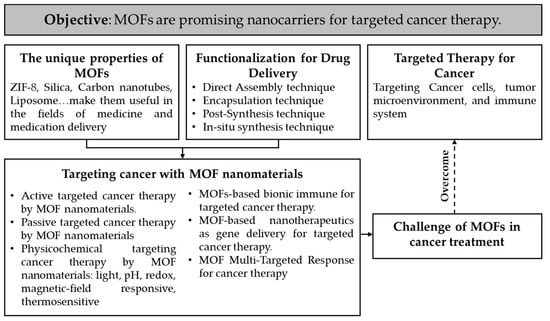 To battle diseases such as cancer, scientists are constantly looking for novel treatments, early diagnoses, and early detection methods. The principal application of MOFs beyond this viewpoint is their potential as cutting-edge materials and systems for cancer therapy []. Also highlighted are several difficult and promising facets of MOF-based cancer diagnosis and therapy. There are also a few successful case studies that can provide a phase change to clinics, but this is a fascinating field of science with progressive breakthroughs that require intense emphasis to fully transfer from bench to bedside. This is a crucial step in identifying the restrictions and barriers to the use of cutting-edge materials, such as MOFs, for the treatment of cancer that has reached the clinical stage [,].