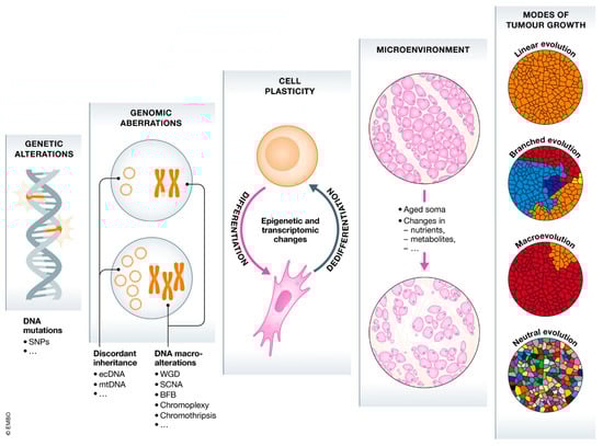 The gradient of cancer development. Microscopic to macroscopic (left to right) examples of the several factors of tumor evolution. Reproduced with permission from []. Copyright 2021 The EMBO Journal.