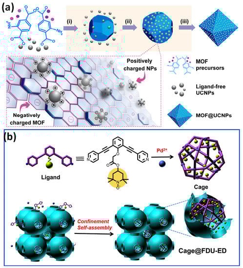 (a) Upconversion nanoparticles (UCNPs) and MOF nanomaterial manufacturing is shown schematically. Direct mixing results in the formation of nanocomposites from the reaction intermediates of MOF and ligand-free UCNPs. The processes demonstrate the three hypothesized formation mechanisms: (i) nucleation of MOFs, (ii) electrostatic bonding of NPs to MOFs, and (iii) production of nanocomposite materials; (b) catalyst with two functions for single-pot sequential reactions using confinement self-assembly and M12L24 cage C in FDU-ED cavities mesoporous to produce cage@FDU-ED is shown schematically. Reproduced with permission from references [,].